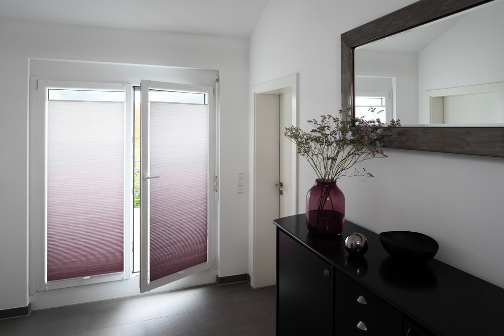 Plissee Duette mit Perlex Beschichtung auch als Sonderform für außergewöhnliche Fensterformen und Dachfenster bieten Plissee-Vorhänge die maßgeschneiderte Lösung, da sie sich überall perfekt anpassen. Dabei tritt die Plissee-Vorhang-Technik gekonnt in den Hintergrund und unterstreicht die optische Wirkung des Behangs.
